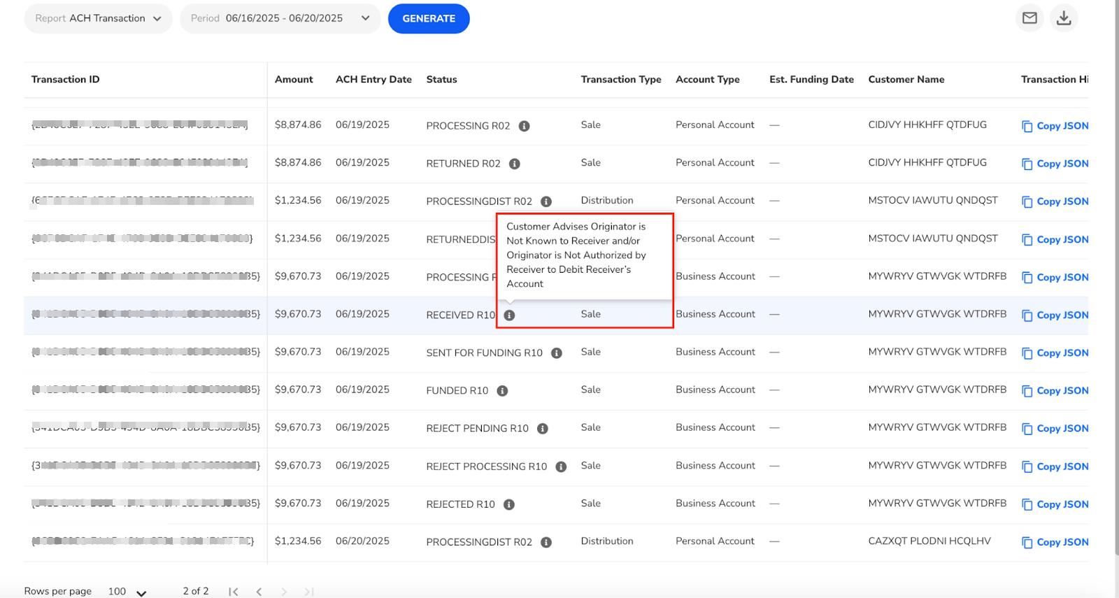 You’ll now see return reasons displayed alongside any returned or rejected ACH transactions.